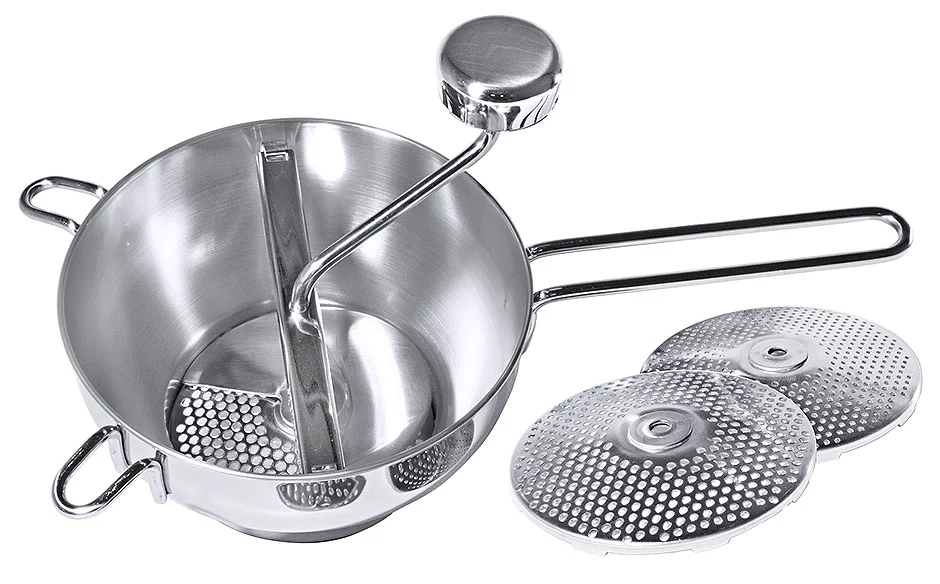 18/10-es rozsdamentes acélból készült passzírozó az 555-ös szériából, 3 db cserélhető betéttel mely tartozék, 2-3-4 mm-es lyukkal, űrtartalma 2 L, átmérője 20 cm, magassága 11 cm. 14 és 16 cm átmérőjű edényekhez javasolt.