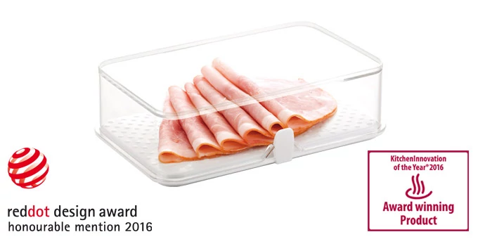 Az egészségügyben és a gyógyszeriparban használatos csúcsminőségü műanyagból készült, kiválóan alkalmas az élelmiszerek higiénikus tárolására a hűtőszekrényben. A felhasznált alapanyag neutrális, még hosszú tárolási idő esetén sincs hatással az élelmiszerminőségre. Dupla, lyukacsos aljának köszönhetően védi az élelmiszert a nedvességfelvételtől, megemelt szegélye pedig nem engedi kifolyni belőle. A dobozok egymásra helyezhetők, a hűtőben így helyet spórolva.Mosogatógépben mosható és a hozzá tartozó színes tartalékzárakegyéni ízlés szerint cserélhetők. 3 év garancia.