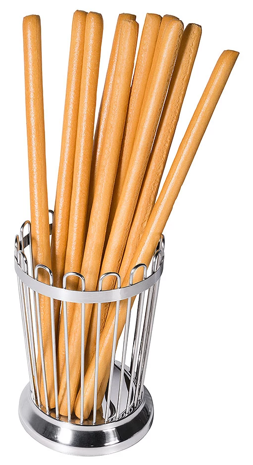 Tükörfényes felülettel 18/10-es rozsdamentes acélból készült kúposformájú Grissini snackkínáló, nagy stabilitást biztosító talppal, átmérője 9 cm, magassága 13 cm.