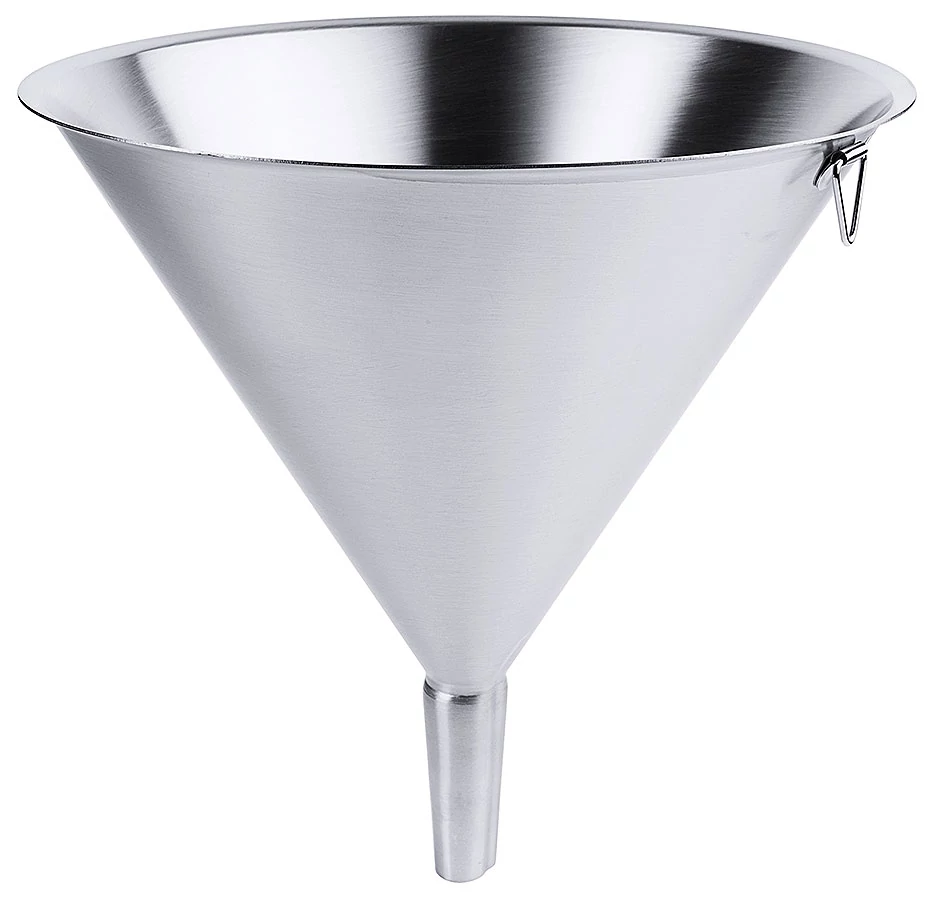 Szaténfényű felülettel 18/10-es rozsdamentes acélból, nagy konyhai felhasználásra készült tölcsér az 5420-as szériából, űrmértéke 2 L, alsó átmérője 2,2 cm, felső átmérője 24 cm, magassága 24 cm.