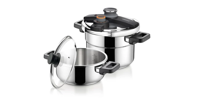 Az ULTIMA luxus minőségű kukta készlet két 4.0 l és 6.0 l edényt tartalmaz, az egyszerű IDEALCOOK tökéletes nyomásbeállítóval kiválóan alkalmas hagyományos ételek egyszerű és gazdaságos elkészítéséhez. A nagy, elfordítható fedőzárónak köszönhetően az edény kényelmesen nyitható és zárható egy kézzel is. Az ULTIMA DUO készlet tökéletesen tárolható, a 6.0 l-es kukta a 4.0 l-be helyezhető. A kukta nyomásjelzővel, 4 biztonsági szeleppel és ergonomikus fogantyúval ellátott. Első osztályú rozsdamentes acélból és ellenálló műanyagból készült. A háromrétegű szendvics alj minden típusú tűzhelyre alkalmas – gáz, villany, üvegkerámia és indukciós. Univerzális üveg fedővel szállítjuk, mindkét edény használható hagyományos főzésre is. 5 év garancia.