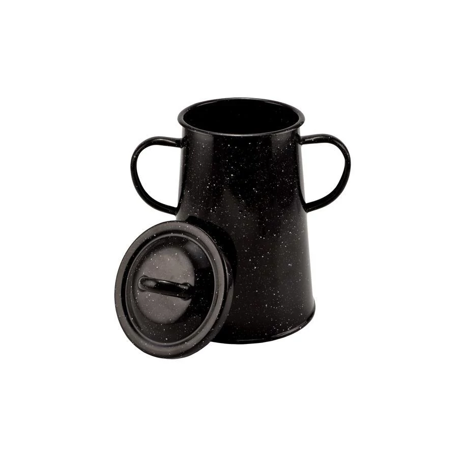 Méretei:19 cm magas fedő nélkül, 22 cm magas fedővel, 12 cm felső átmérőjű, 14,5 cm alsó átmérőjű, 19 cm szélessége füllel együtt